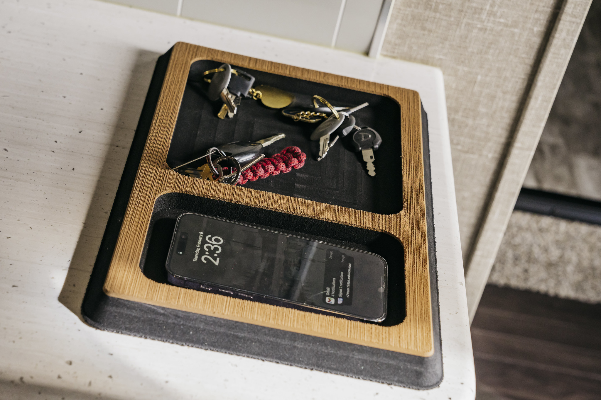 This design features a cell phone pocket and an extra cut out for additional storage.
