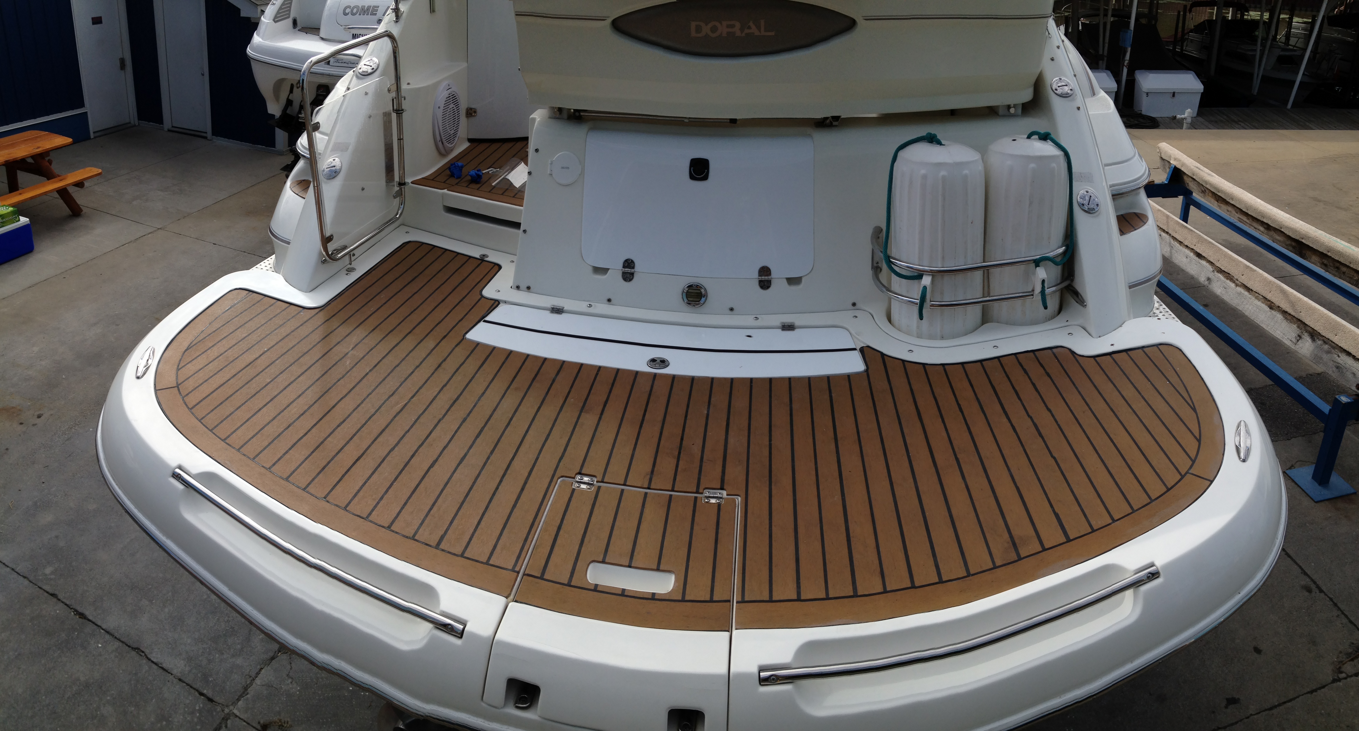 Here are a few pictures a customer sent us of a boat going through the transformation from a hard synthetic deck material to SeaDek.